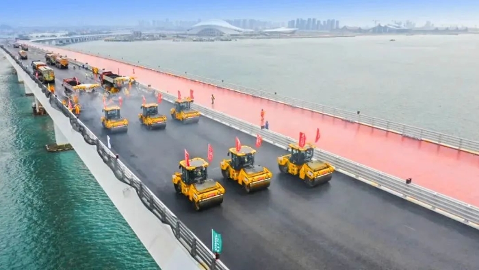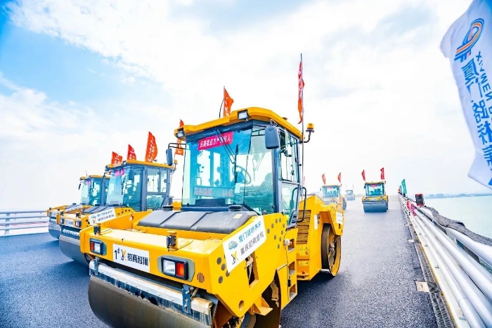 翔安大桥在建设中既要克服海上风浪大、潮差高、岩层强度高、跨越生态保护区等困难,又要兼顾绿色环保;要在这种复杂的环境中保证施工质量,对设备和施工技术的选择就显得尤为重要。星空官网数字化智能施工集群凭借其智能化、高精度、高效率等显著优势,成功克服了传统施工方式难以应对的诸多难题,可精准适配翔安大桥的桥面铺装工作。