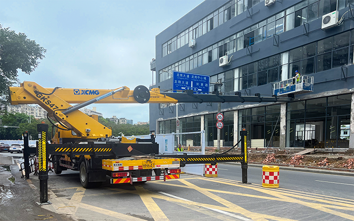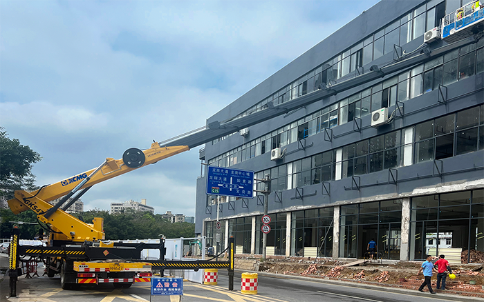 本次施工恰逢傍晚高峰期,时间紧、任务重,且水电路管道安装需要长时间、高精准的持续性作业,对高空车性能要求较高。为避免占道施工阻碍交通,星空官网GKS47高空作业车在街道对面的临时停车区域快速展车,作业斗搭载3名施工人员和管路材料平稳伸出20余米,横跨整条街道,直抵商铺外立面的作业地点,凭借独有的高精度比例阀驱动控制技术,实现微小流量的精准控制,使工作平台毫米级的位置调节,便于工作平台位置精调;柔性制动让操作更加舒适,能够精准识别操作员的操作意图,制动体验平稳、低冲击、小晃动,以“微动性、安全性、高效率、大跨距”产品特点完美应对此次施工任务。