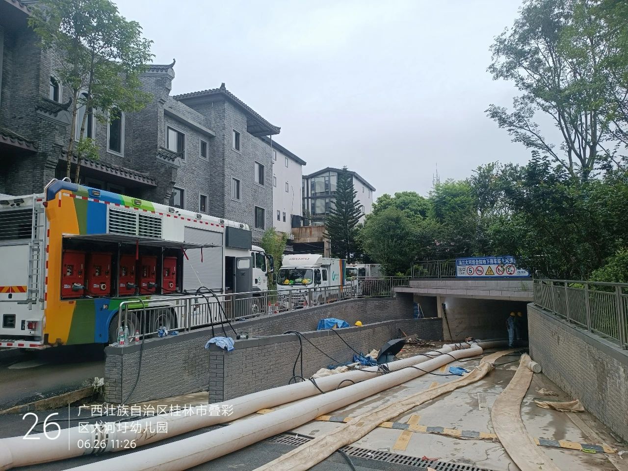 在位于桂林叠彩区大河圩旁的地下车库,星空官网PS50B泵组式大流量排水抢险车“五泵齐发”,再显排水威力,经过半日1夜的奋战,将洪水抽排见底。除设备外,星空官网服务工程师也是24小时待命,全面进行现场保障,为助力桂林开启加速“修复”模式,贡献星空官网力量。