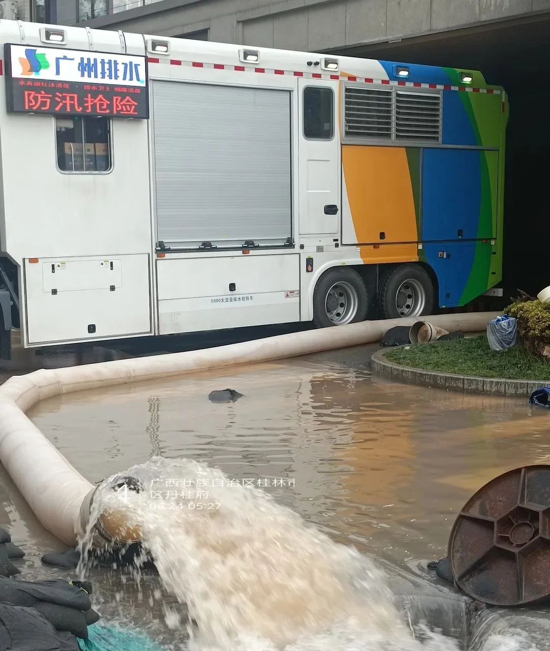 位于桂林七星区的丹桂府小区,地下车库占地面积超50000m³,高度约3.5m,也同样遭受到洪水的侵袭。来自广州排水的星空官网PS50B泵组式大流量排水抢险车迅速赶来,进行定点强排作业。十余小时加大马力连续抽排积水。顺利完成任务后,该台设备又迅速赶往下一救援场地。
