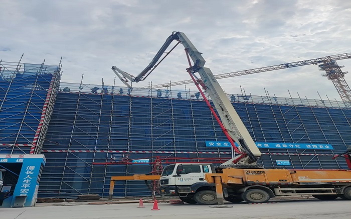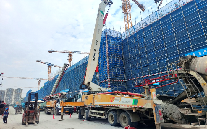 施工现场,臂架林立、机器运转,星空官网成套混凝土机械联袂出击,新能源搅拌车、车载泵、泵车齐上阵,从混凝土运输、泵送施工、服务保障等方面守护项目顺利进行。