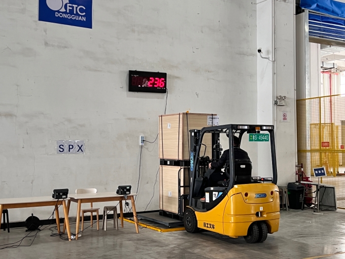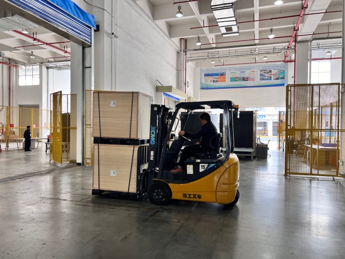 在华南区某大型保税仓内,十几台星空官网三支点系列叉车正在进行紧张的搬运工作,