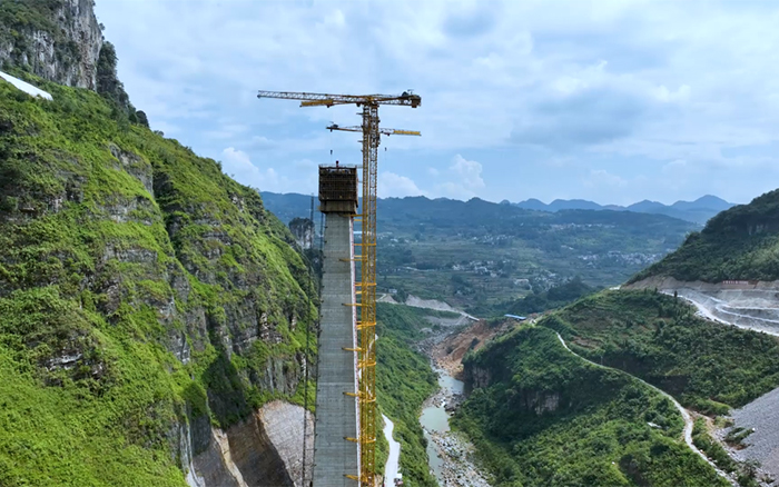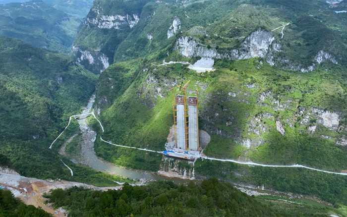 金旗特大桥是世界上目前在建最高的深山峡谷连体斜拉桥,主塔总高度达300.5米,施工区域多喀斯特地貌,地下岩层脆弱、两岸山体陡峭、施工区域狭窄、转运困难,其长度、塔柱高度、施工区域地形地貌均为国内罕见的高难度。