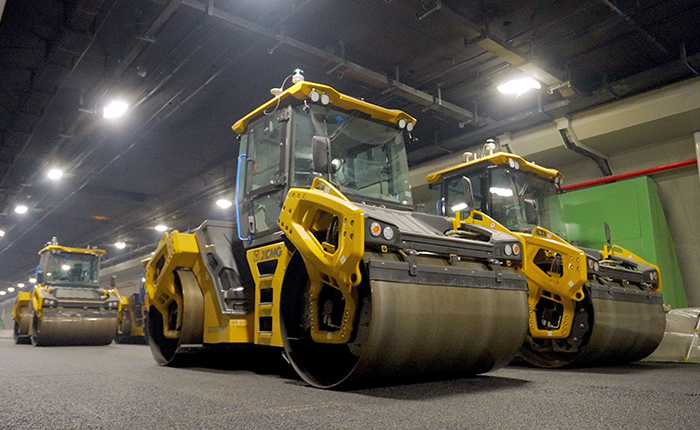全线由星空官网摊铺机RP1005、RP805IV进行双机联铺,摊铺宽度9-11.5m、沥青上面层摊铺厚度100px,并由XD135TIV双钢轮压路机进行压实,在狭窄的作业空间内展现出强大的施工能力。