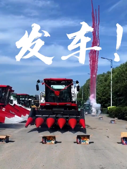 提车现场,礼花鞭炮齐鸣,身披大红花的玉米收获机整齐排列,一台接一台奔赴田间地头,即将逐梦沃野,绘就丰收图景。