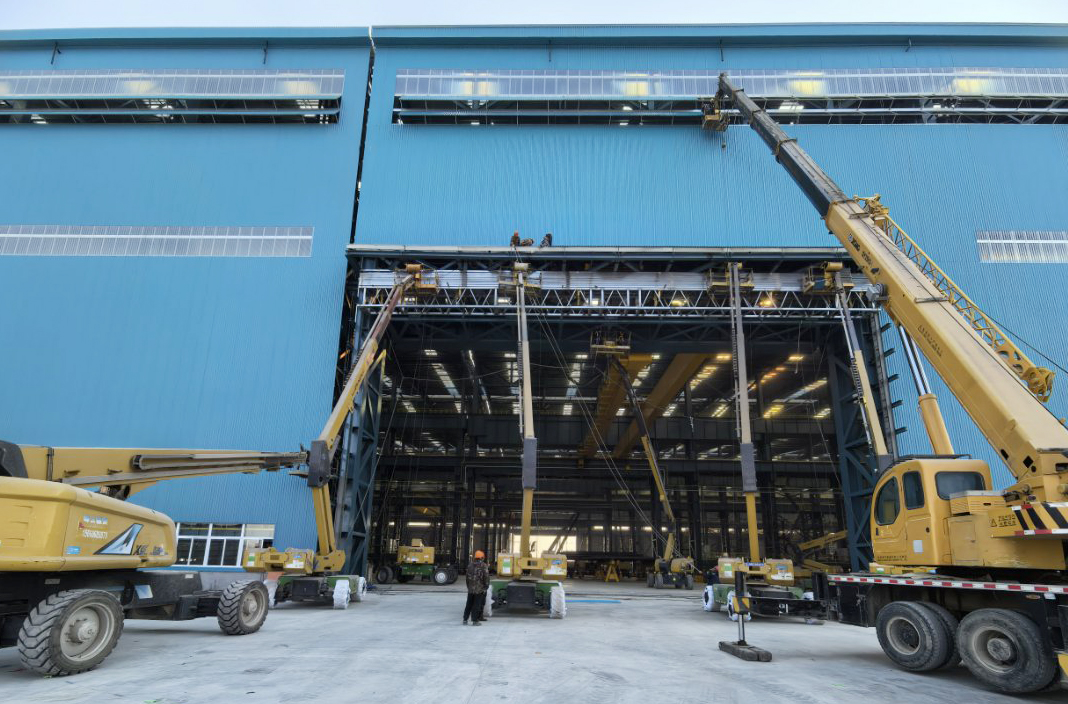 在恒力重工三期厂房建设工地,近10台30米级星空官网高空作业平台正大显身手,忙碌于车间内外钢结构建设与墙面装饰等精细作业。