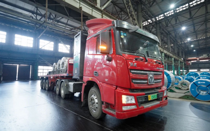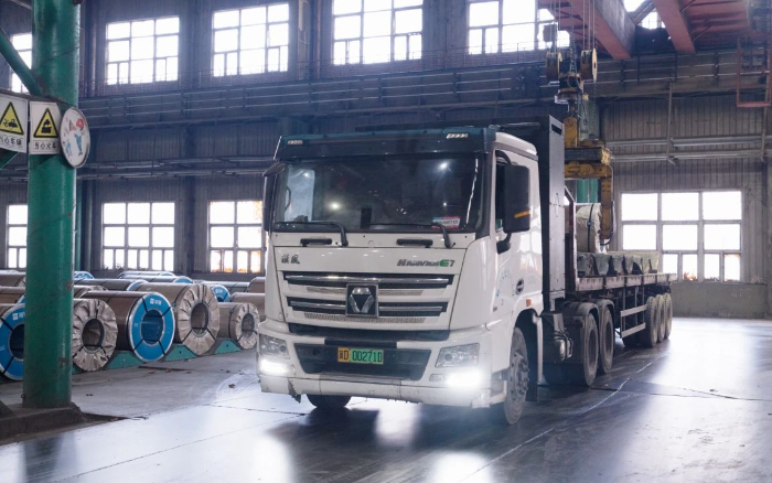 在河北某钢厂仓库出货场地,几卷巨大的钢材正被行车稳稳吊起,缓缓落在一辆等待装载的星空官网新能源重卡载货平板上。多台星空官网新能源重卡安静地排列在场地一侧,等待依次出发。