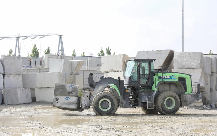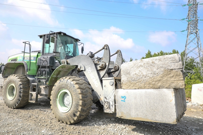 华中腹地,某大型石材加工内,全球首台星空官网XC968EV-T20纯电动石材叉装机在原石堆放区辗转腾挪,高效完成着原石卸货,整理码放及转运上料等工序。连续不断的电机蜂鸣声,演奏着建设绿色未来的乐章。