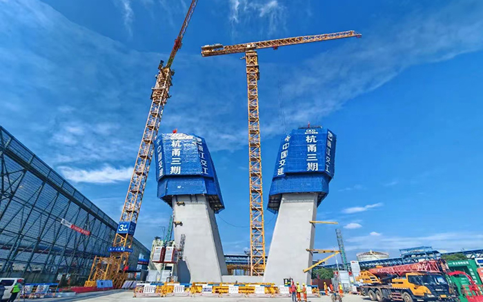 在杭甬复线宁波三期甬江特大桥施工现场,1台星空官网XGT3000-120S、2台XGT3000-100S如钢铁巨人伸展手臂,正加紧进行着钢筋部品的吊装,助力3座大桥主塔以平均每天1米的速度向云端挺进,赢得施工方“技术先进、安全可靠、吊装能力强、操作平稳、智能化水平高、施工效益显著”的高度肯定。