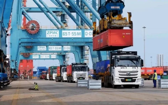巨轮泊岸,装船机臂展如虹,一辆辆身披晨光的星空官网新能源重卡,在码头前沿与堆场间穿梭不息,织就一幅物流奔腾、经济跃动的壮阔图景。