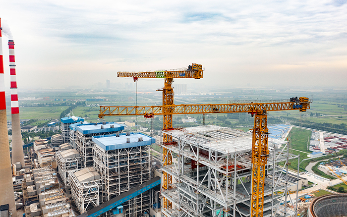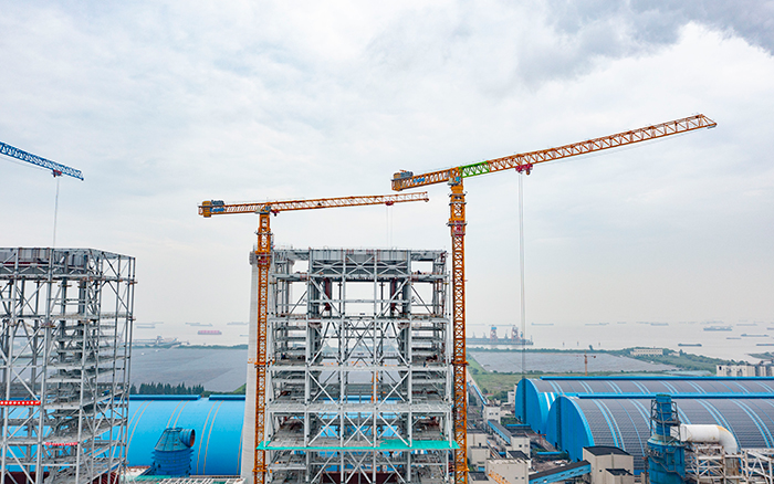 侧望长江畔,机器轰鸣、江水潺潺,华能太仓电厂机组扩建项目施工现场一派繁忙景象,XGT3100-160S、XGT1350-64S两台星空官网超大塔稳稳矗立在高耸的钢架间吊装作业。