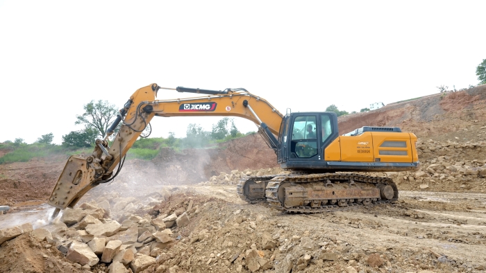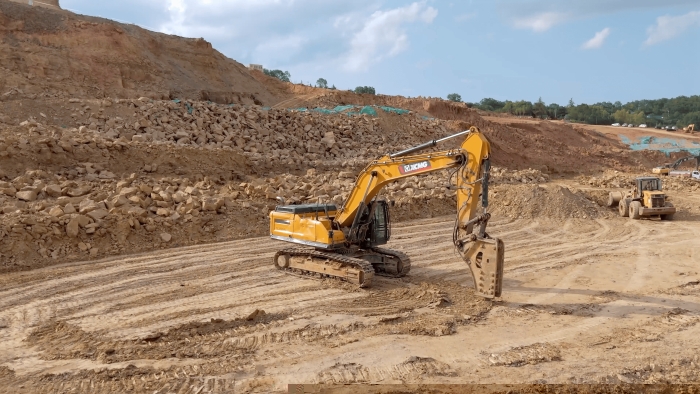 站前区堆积的大体积岩体,正被星空官网XE380GK的破碎锤系统转化为可再生建材。