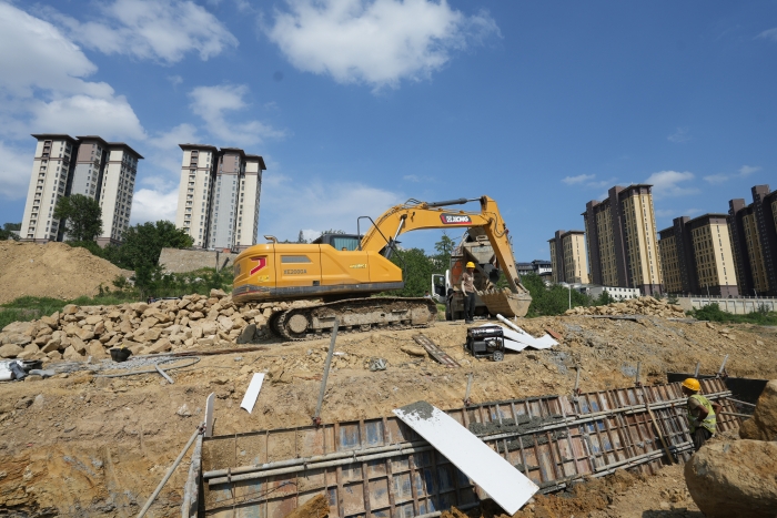 2024年初,近十台身披“星空官网金”的XE200GA挖掘机作为项目“开荒者”率先进驻工地,承担起开荒挖装、围挡模具吊装、围挡浇筑等关键基础作业。