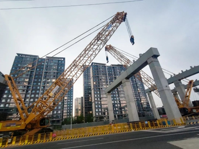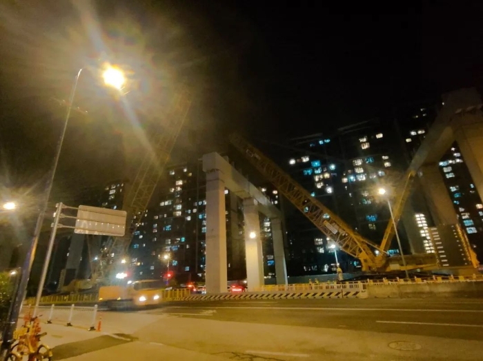 狭窄空间内,两机协同微调,在进行精确转场移动的同时,也避免了任何晃动或扭转,重物分毫不差地平稳落位至预定桥墩支座上,整个过程高效流畅,一气呵成。