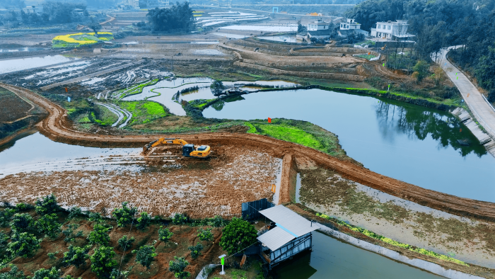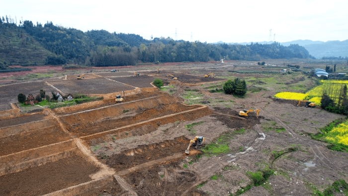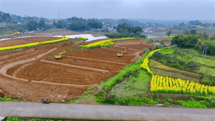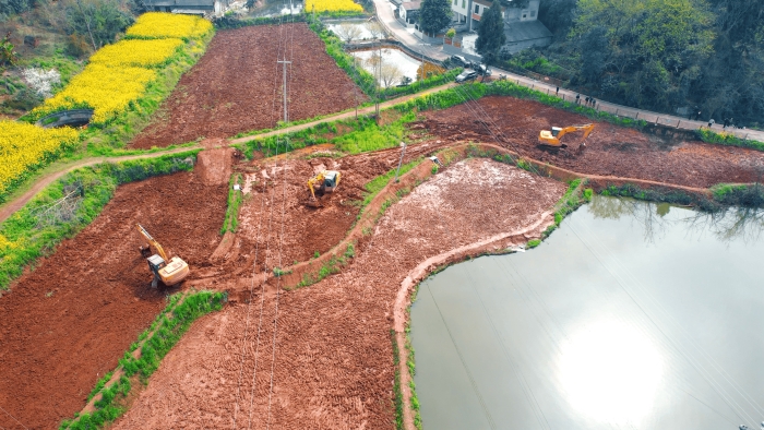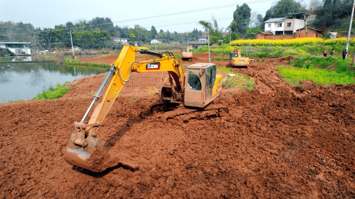 继续向东,这里是万里长江第一城——宜宾,在宜宾江安县阳春镇,5000亩高标准农田建设进入尾声,项目高峰期投入30余台星空官网挖掘机。