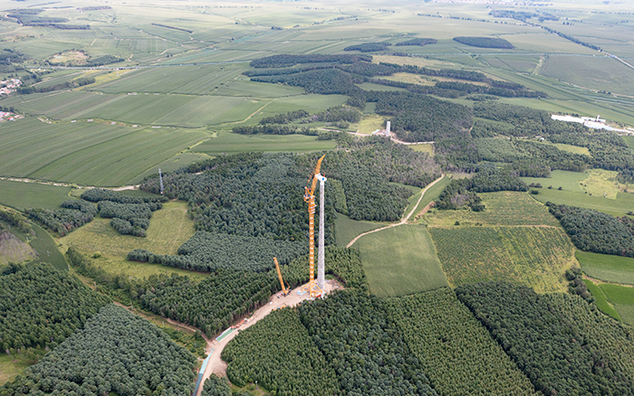 在项目施工现场 这台星空官网3300吨米级动臂塔机 将重达150吨的机舱吊至160米高度 快、稳、准,高效吊装一次就位