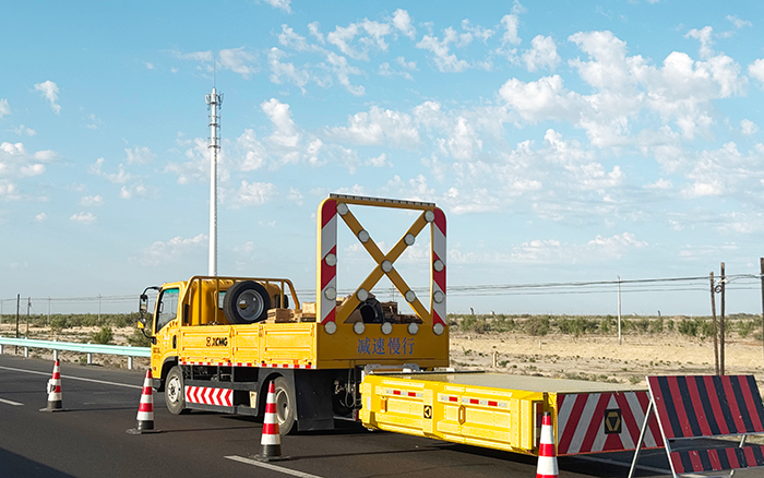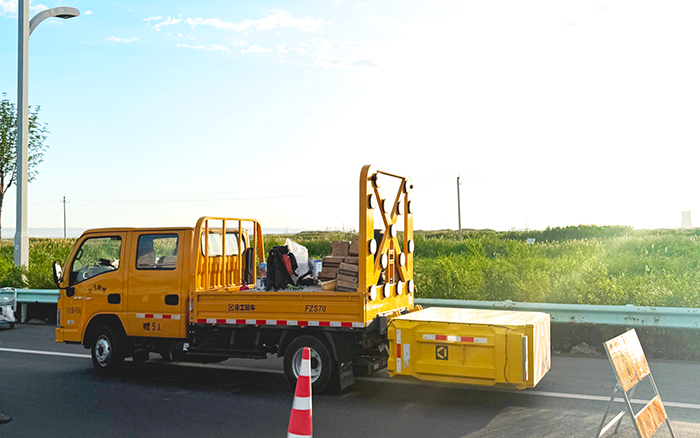 不光是安全卫士,它们还是高效的 “移动仓库”。货箱敞开着,里面整齐码放着铁锹、沥青、警示锥等施工所需的工具和材料。施工时,人员无需来回奔波取物,伸手就能拿到需要的东西,让施工节奏得以加快,省去了不少麻烦。当施工收尾,防撞缓冲车驶离后,留下的不仅是平整的路面,更有它们为这次施工全程护航的印记。