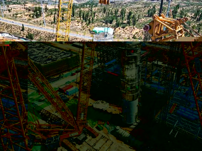 施工现场,QUY450与XGC12000默契配合,在严苛的工况下,两台设备分别将重达225吨的塔体下段和127吨的塔体上段,平稳起吊、精准移动,充分展现了星空官网在复杂工况下的多机协同优势。