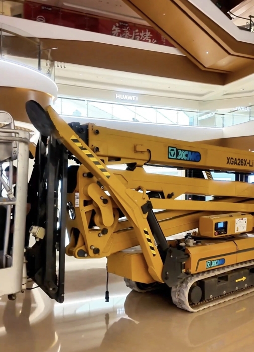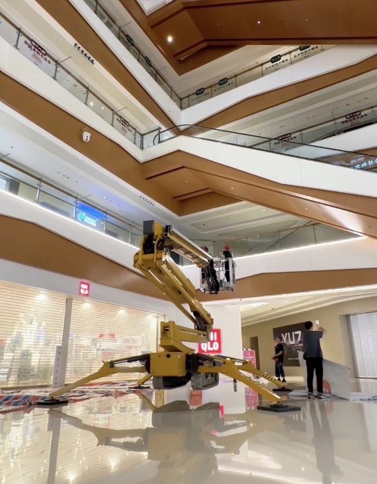 在杭州某大型商场,星空官网XGS26X-Li将四只“蜘蛛腿”稳稳“扎根”在商场中庭,正在向玻璃围栏下方的墙壁伸展臂架。超窄车身“溜”进商场、伸缩臂架“瞄”准墙面,这是星空官网蜘蛛车在商场进行维修保养的日常。而看似日常的施工,需要面对三关“难题”。