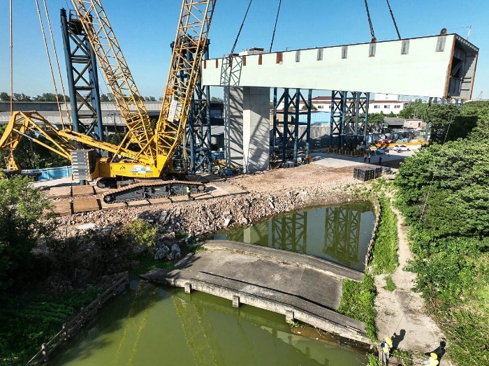 施工现场,XGC11000以66米超起主臂工况担当主吊,成功将11段预制节段梁全部精准就位,其中最重段达270吨,尺寸为45米×8米。