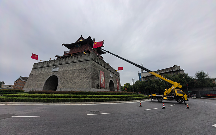 从设备就位到首面国旗挂好,施工迅速完成。过往市民纷纷驻足拍照,文昌阁周边的节日氛围随国旗悬挂愈发浓厚。多重安全保障与高效作业能力,让 “中国红” 在古建筑旁庄重飘扬,也让爱国情怀随秋风传递街巷!