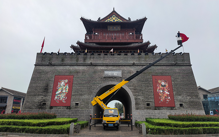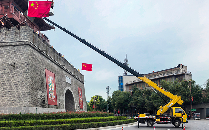 文昌阁前,一抹抹 “中国红” 悄然升起。星空官网 M 系列 GKS32 高空作业车伸展长臂,稳稳将施工人员送达高空作业点。最大作业高度32 米,精准覆盖建筑立面,转台 360° 连续回转间,国旗已平稳就位。