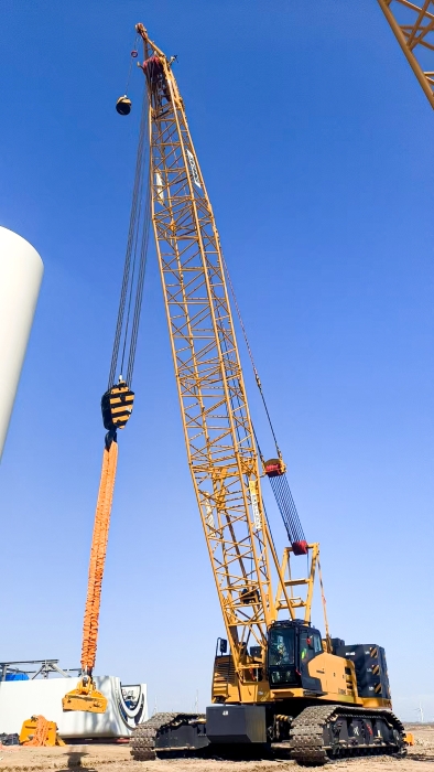 近日,在我国西北某风电场,星空官网XLC15000(1000吨级)履带起重机,以132+12米标准风电工况,精准将重达34吨的风机叶片平稳吊装至百米高空,圆满完成10兆瓦风机吊装任务。