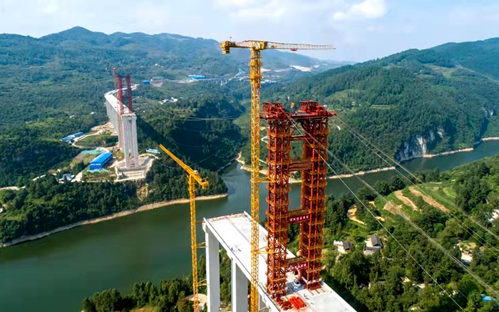 承担大桥缆索吊系统架设的是星空官网S系列塔式起重机主力机型--XGT7022-10S。在大桥拱肋首节段吊装过程中,“星空官网金”凭借“精、准、稳”,为大桥的高质量、高安全、高效率的施工提供了有力保障,为德余高速公路建设按下“快进键”。