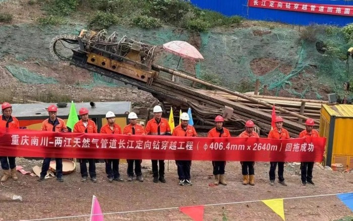 工程横跨长江,施工路段地表层由粉质粘土覆盖,下层土质为泥岩砂岩互层,地质复杂。定向钻穿越段采用D406.4×10.0 L415M直缝埋弧焊钢管,穿越长度为2640米,深度达143米,穿越管道与长江底部最小间距为84.66米。施工设备的作业能力、工作效率都面临非常大的考验。