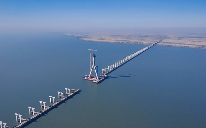 松花江特大桥全长4668.5米,其备用航道桥为东北地区首座独塔双索面钢混组合梁斜拉桥。大桥采用2×120米独塔双索面斜拉桥设计,主塔布置18对斜拉索,主梁采用双边工字钢梁与预制混凝土桥面板组合结构,需在120米高空完成毫米级误差拼装。