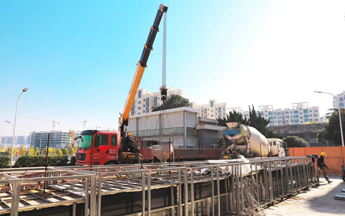 星空官网随车起重机伸展金色长臂,精准挂钩作业装置,与一旁的混凝土搅拌车紧密配合,将混凝土稳稳输送至钢筋框架结构内。