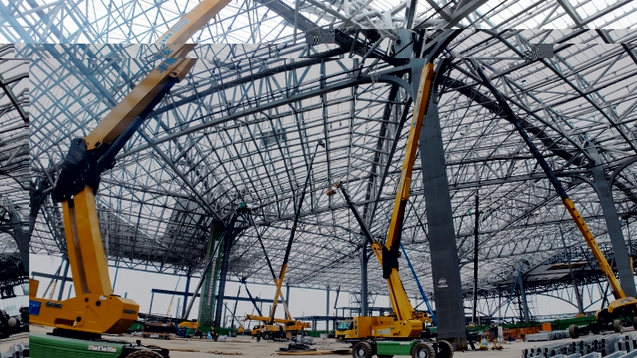 西安东站建设工地上,星空官网高空作业平台组成“钢铁军团”正全速推进施工。10余台30-40米直臂车伸展巨臂,精准对接站房屋顶钢结构焊接;12米剪叉车灵活穿梭,高效配合内部砌墙作业。