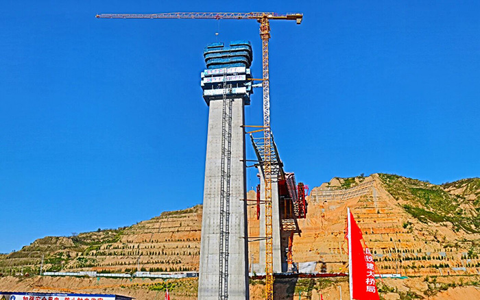 临猗黄河大桥主桥最高墩是钢箱梁连续顶推施工节点的控制性桥墩,施工难度大、风险高、工期要求紧。星空官网XGT6015-8S1塔机高效运转,游刃有余的应对紧张、繁重的吊装任务,为项目建设保驾护航。