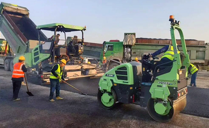 在河北道路施工中,星空官网RP905HEV混动摊铺机与XD120EP纯电压路机组成“新能源搭档”。