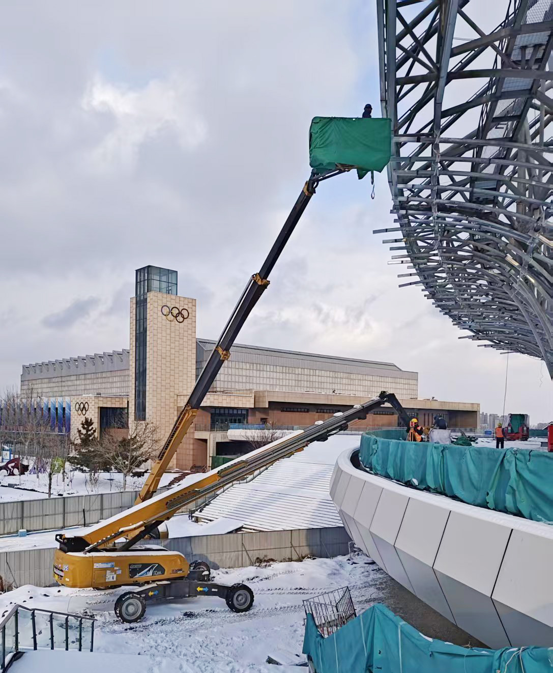 近日,全国多地气温骤降,城市迎来普遍降雪。位于山东烟台的蓬莱体育馆建设项目正面临冬季雪天施工的严苛考验,为保障施工进度,XGS30K、XGS40K、XGS45K、XGS58K等16台星空官网高米数柴动直臂高空作业平台,组成“高空攻坚队”顶雪作业。